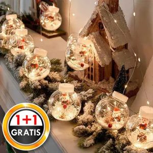 Le palline trasparenti contengono simpatiche statuine, neve artificiale, pigne e luci LED.